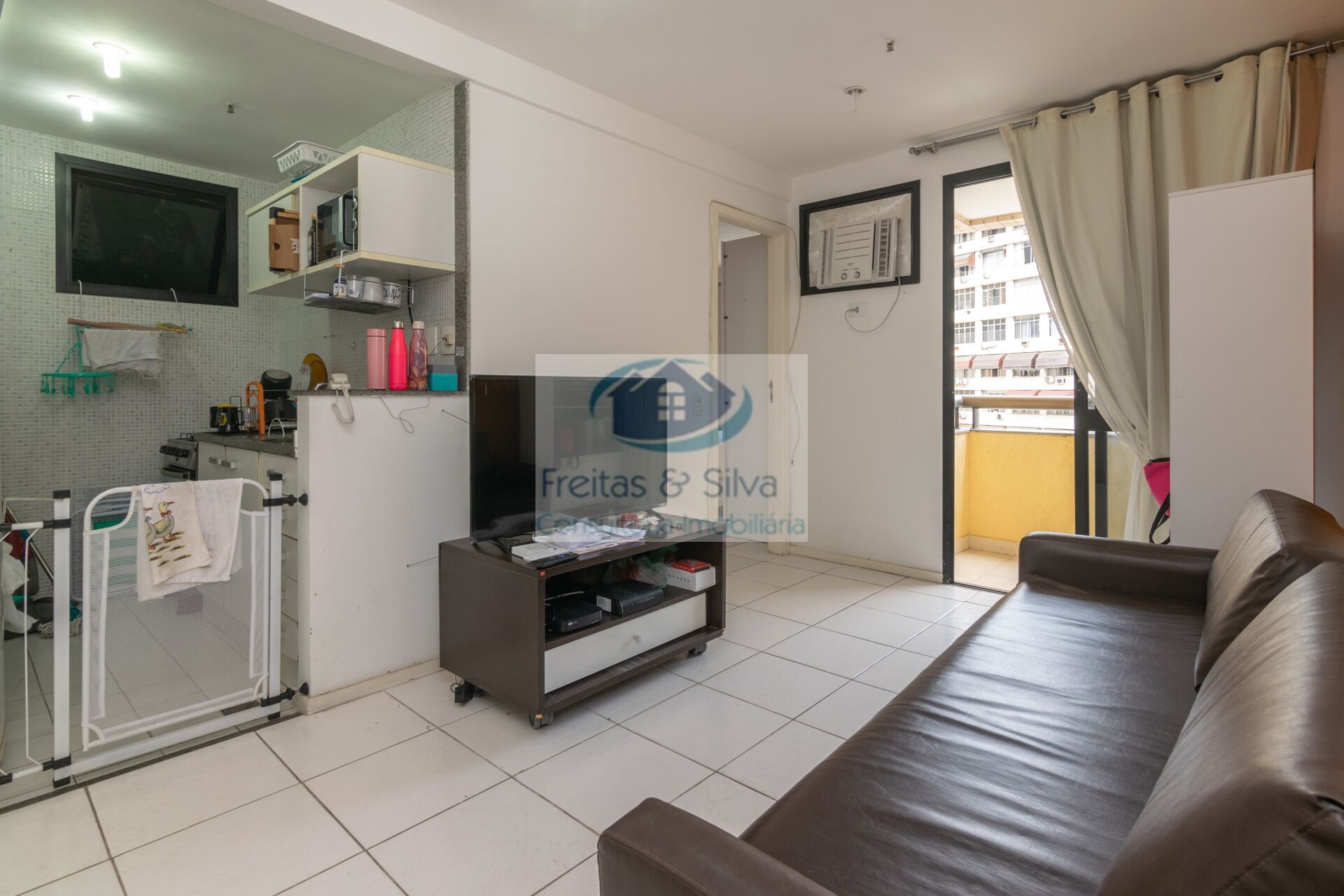 Sala com sofá cama, mesa e TV; sacada; cozinha americana completa com fogão, geladeira, micro-ondas e mobília; suíte com cama de casal, banheiro com bancada em granito e box blindex; armários em todos os cômodos; ar condicionado na sala e no quarto; internet e TV a cabo.
